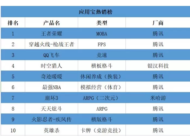 榜单基本维持年前排名,《王者荣耀》《穿越火线》《QQ飞车》三款竞技类游戏包揽前三,休闲类游戏《奇迹暖暖》和卡牌竞技游戏《英雄杀》进入前十。