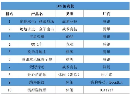 经过7天假期,腾讯两款正版《绝地求生》手游《绝地求生:刺激战场》和《绝地求生:全军出击》超过了王者荣耀,排在榜单的前两名。《QQ飞车》维持前五名位置,《欢乐斗地主》和《腾讯欢乐麻将全集》上升迅速。《汤姆猫跑酷》首次进入前十。